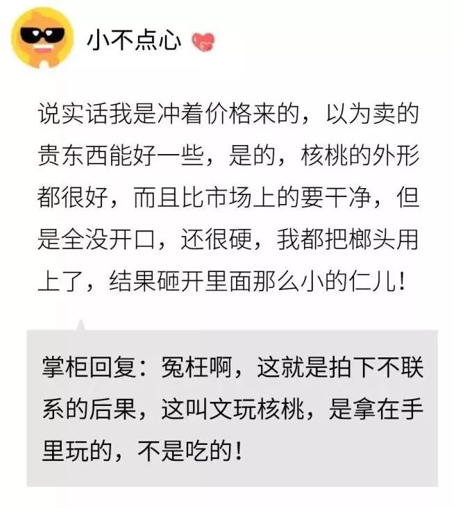 淘宝爆笑差评截图 1、这是一个让人无语的差评,遇见这样恶毒又诚实的买家只能自认倒霉了。不过这位买家心理也太不健康了,怎么能因为受了点伤害就报复社会呢!! 2、不瞒大家说,这个差评小编一共才看了八遍,真的笑的我两腮都疼了。这位老兄这想象力和文笔不去当个作家实在是有点可惜了,只是这个LOGO确实也是真的搞笑啊。 3、最后一位,把文玩核桃砸开吃的老兄,我只想说这样炫富真的好吗? 以及笑到窒息的买家秀来了 淘宝产品质量参差不齐,图片拍的美得让人窒息但是实物看了就会让人吐血,买家秀和卖家秀的对比来喽! 1、mac口红的买家秀,虽说死亡芭比粉,不过涂在这位老兄嘴上感觉并不违和,都让人有想去死的感觉,这个画面让我瞬间想到了石榴姐,估计卖家一会就会给红包求删差评了。 2、这条开叉的裤子,如果真穿出去回头率肯定会有的。 3、买的是裙子,发的是护膝啊!确定不是发成童装了吗,这样子的不给差评太不人道了! 4、严重怀疑这位买家是把卫衣折叠起来故意发买家秀勒索红包的。 5、这套装备绝对是阿宝同款,不去放羊有点可惜了。 6、当年的梅宗主披风,玉树临风啊,这个买家一定是打开方式不对。 7、卖家秀性感窈窕,买家秀像一个穿红袍的煤气罐。店主你过来我绝对不打死你! 小伙伴们,你们有没有好笑的买家秀呢,来分享一下吧! |