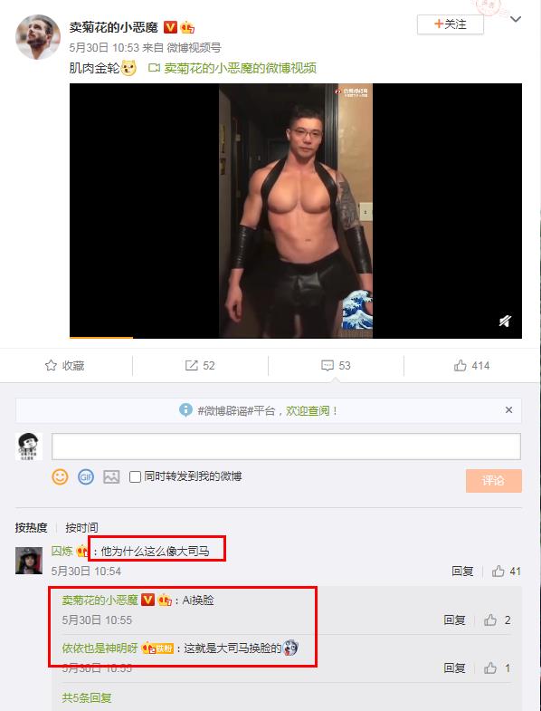 最近网络上一个“肌肉金轮”的梗火了,视频中,一个面容是大司马的人,拥有一身“腱子肉”,看的大司马本人都表示“羞涩”。当然这身腱子肉并不是大司马的,而是一个外国小哥的,脸确实是大司马的,通过AI换脸技术,给结合在一起了,下面是对应视频截图: