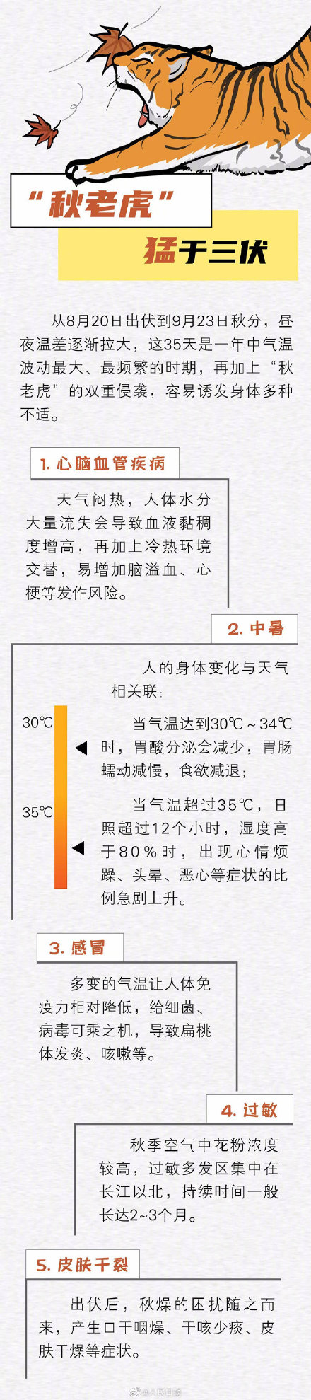 ![]() 经常关注天气预报的网友可以发现,秋老虎的产生是因为“副热带高压”气候导致的。比如8月28日至9月2日,上海将持续晴热高温天气,极端最高气温可达36~37度,这就是典型的秋老虎天气,这次极端的秋老虎天气影响上海一周左右,9月3日开始逐渐缓解。@生命时报制作了一份详细的秋老虎天气的养生、防护指南,大家可以仔细看看: ![]() ![]() ![]() ![]() ![]() ![]() |