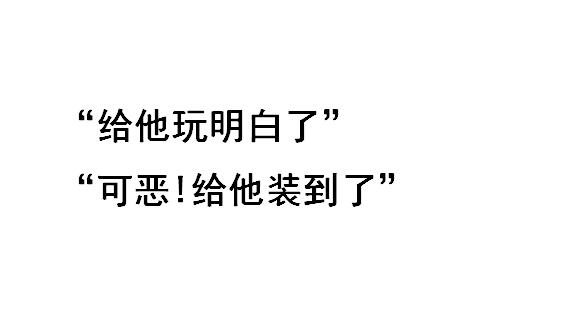 “给他玩明白了”“可恶给他装到了”都属于带有调侃性质的赞美,常见于对游戏类主播的评价,比如说一位主播平时水平很菜,经常战败,突然有一天好似顿悟一般,如同打通任重二脉的高手,变的打法流畅游刃有余,这时候就会有网友评论说“给他玩明白了”“成功被他装到了”