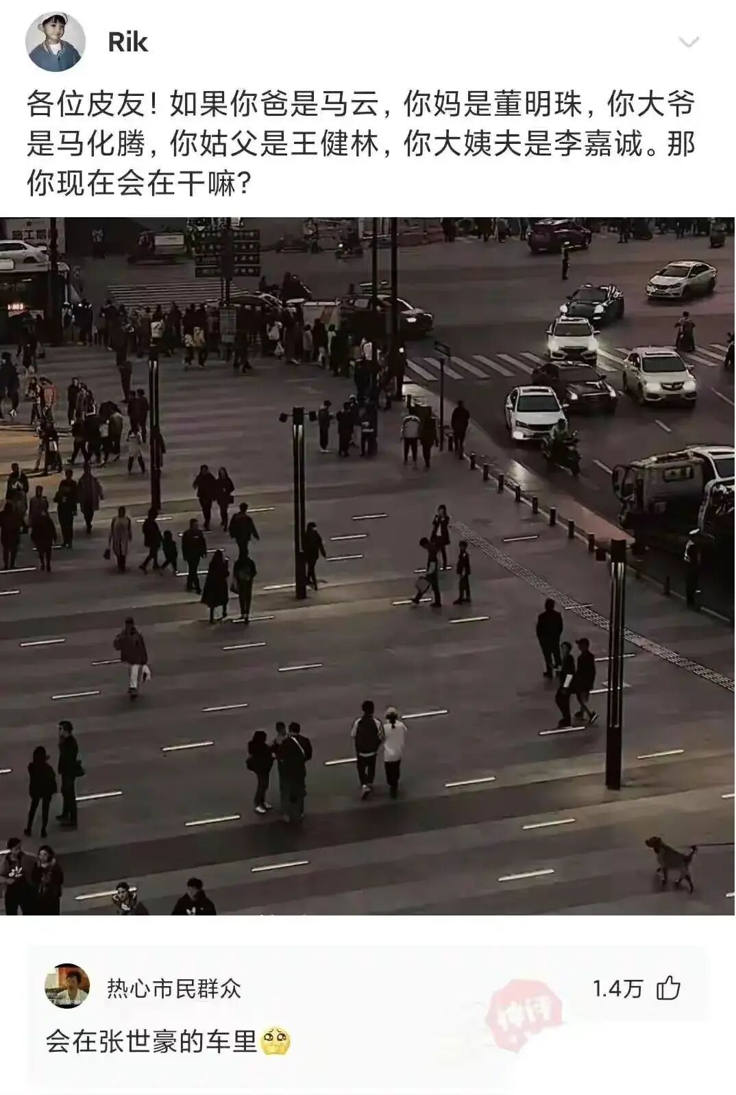 在网络上有一个提问如下图,大约是说你的爸爸妈妈、亲戚朋友全是中国响当当的有钱人,那么问题来了“你现在在干嘛?”,神评是:“在张世豪的车里”。对于这个神评,相信只有看过《插翅难逃》这部戏的才知道,在这部戏中,张世豪是个绑匪,专门绑架有钱人。神评的意思是这么有钱的组合,估计只有在电视剧中才能看到,同时也会被张世豪这样的人盯上。