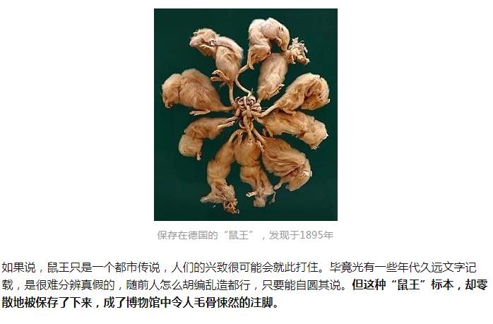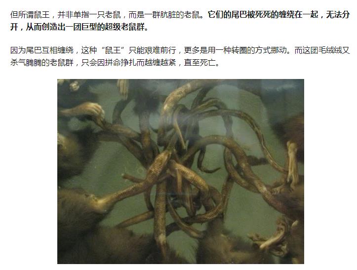 曾经看过这样一个新闻:一个阿姨在家中发现有老鼠踪迹后了,就专门买了老鼠药放在家中,第二天在老鼠药附近发现了一只老鼠一动不动,以为它死了阿姨就想用手拿走,没想到被老鼠咬伤了,这个新闻让人看的不寒而栗,对老鼠的智商也是十分好奇,那么老鼠的智商相当于人的几岁智商? 其实老鼠种类也是非常多的,不同种类的老鼠智商也不一样,不过老鼠确实是很聪慧的动物,而科学家喜欢拿老鼠做实验,就是因为老鼠和人类的基因链相似程度非常高,可以说是相差无几,而且据科学研究发现,老鼠的智商相当于人类儿童八岁的智商,从某种程度上来说,人类和老鼠的相似性,可能要比人类和猴子的相似性还要高。 一般来说老鼠的体积都是非常小的,但也有例外,有些老鼠甚至能长到一米,不少人以为鼠王指的是长得非常大的老鼠,其实并不是这样的,鼠王指的是很多只老鼠尾巴缠绕在一起的一种现象,通常被认为是不详的预兆,据说鼠王现象最早出现在欧洲,尤其是德国地区,在一些博物管中,还留存着一些鼠王的标本,最大的一个标本,就是在1828年发现的有32只老鼠尾巴缠绕在一起的鼠王,光是看图片都让人觉得十分震撼。 真正的鼠王图片长这样 |