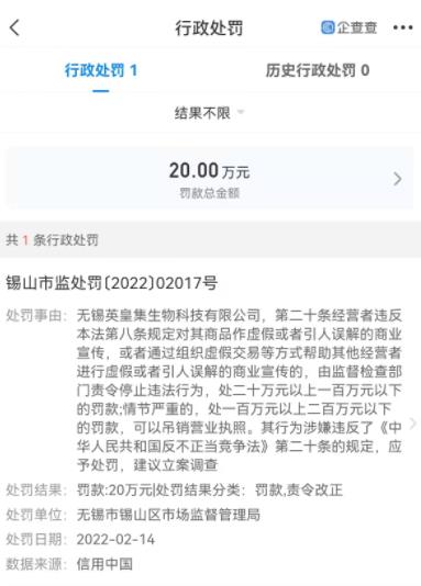 最近一个网红因为吹牛炫富惹上事了,这名网红叫“燕大大”,她曾经在视频中说自己在2019年一天就赚了1.5个亿,结果被网络打假人士“@纠正哥”直接举报到税务局,称其偷税漏税。燕大大给自己的头衔是“英皇集董事长”,“英皇集”通过天眼查发现全称是:“无锡英皇集生物科技有限公司”,注册资本500元。该公司其中一位股东是陈某燕,不知道是不是燕大大本人。最新的一份公告显示,该公司因为“虚假或者引人误解的商业宣传”,被罚款20万元。