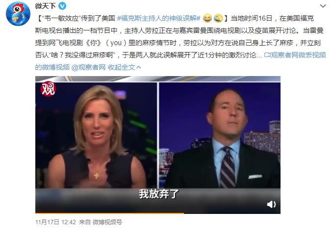 最近韦一敏效应还传到了美国,在美国福克斯电视台播出的一档节目中,主持人劳拉正在与嘉宾雷曼围绕电视剧以及疫苗展开讨论。当雷曼提到网飞电视剧《你》(you)里的麻疹情节时,劳拉以为对方在说自己身上长了麻疹,并立刻否认“啥?我没得过麻疹啊”,于是两人就此误解展开了近1分钟的激烈讨论. ![]() 因为韦一敏效应被大家广泛的调侃使用,甚至用来编段子,由此又出现了一个新梗叫“韦一敏,这盛世如你所愿”,这里的意思是指的“韦一敏效应太火了,大家都在模仿”,来给大家上一波韦一敏效应被广泛运用的聊天和评论时刻: ![]() ![]() ![]() ![]() ![]() ![]() ![]() ![]() |