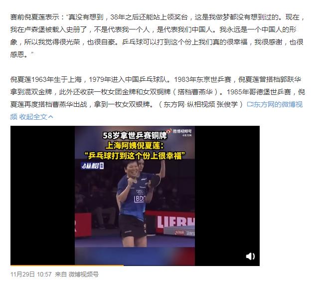 今天“上海58岁阿姨获得世乒赛铜牌”这个话题登上热搜,很多网友以为是公园大妈得了奖牌,其实还真不是,这位得铜牌的阿姨叫倪夏莲,她1963年生于上海,早前本身就是国家队的,世乒赛女子双打半决赛中,58岁的倪夏莲与搭档德纳特以0-3输给孙颖莎/王曼昱,无缘决赛,但由于世乒赛不设三四名争夺赛,代表卢森堡的倪夏莲已锁定一枚铜牌。时隔36年再次拿到世乒赛奖牌,倪夏莲创造了历史。