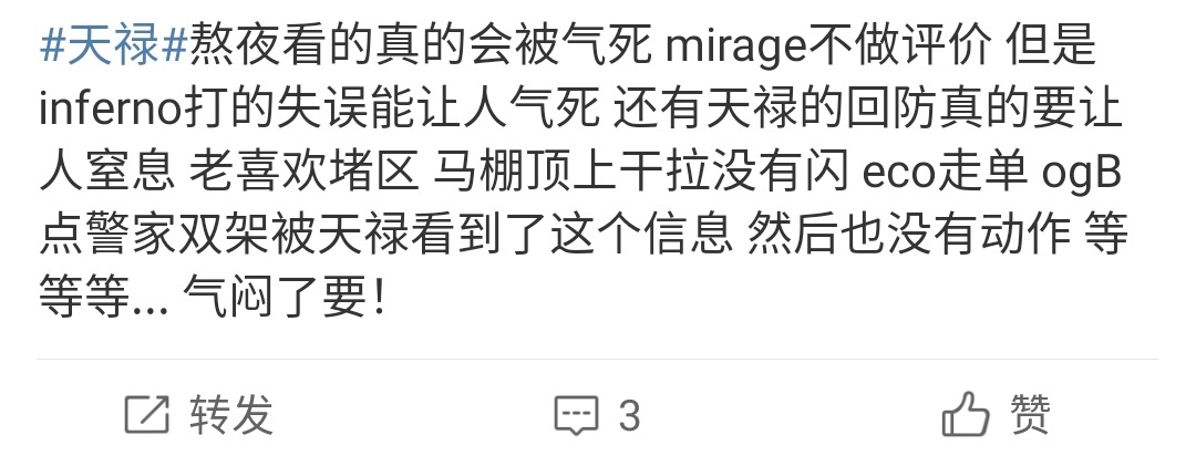 在近日IEM冬季赛的比赛中,TYLOO(天禄) 0-2不敌OG,遗憾告别本届赛事,对于这次输掉比赛,大部分网友表示十分可惜,希望天禄再接再厉。有网友说:“今天输的确实有点可惜,不过后面还有败者组的BO3,我依然相信天禄。”