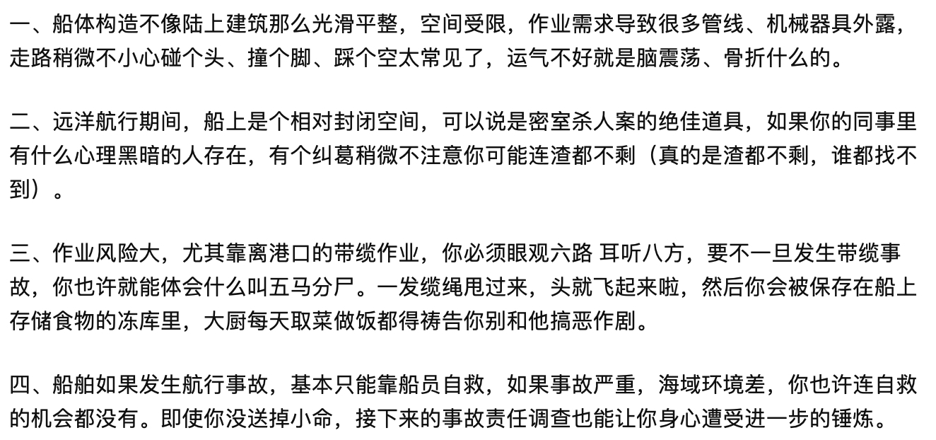 在一些招聘网站上,经常可以看到招船员的信息,尤其是远航船员,似乎需求量很大,而且薪资待遇也是非常高的,非常适合年轻人,不过远洋船员并不是那么吃香的,很多人都说远洋船员非常可怕,那么这是什么原因呢? 在古代跑船是非常辛苦的,死亡率更是居高不下,虽然现代科技发展迅速,但是一些天灾人祸还是人力无法企及的,尤其是在大海上,如果船只出现问题,基本上就只能听天由命了,其次就是远洋船员需要忍受长久的寂寞,这种寂寞可能会加深人内心深处的恐惧,据说大多数船上都是没有信号的,因此非常枯燥乏味,也无法和家人、朋友联系,一年中大概有八个月的时间是在船上度过的,所以并不是所有人都适合这个工作,尤其是对爱玩闹的人来说,无异于坐在一个移动的牢笼里,所以才会让人觉得可怕。 据说远洋船员的工作流程都是非常简单的,就是维持船只运行,定期检查设备和物资供给,以及救生设备是否正常,在船上值班或者巡逻,而且由于船只的不同,所做的工作也不一样,比如说货船和渔船是完全不同的,而且每个船员的工作范围也不一样,是不能一概而论的。 ![]() |