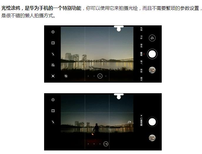 ![]() 要想光绘成功,就必须用长时间的曝光模式来进行拍摄,需要选择相机里长时间曝光的拍摄模式,并调节 Magilight 中各种参数设置,比如RGB值,平衡,亮度等等; ![]() 其实现在的智能手机也可以拍出来光绘作品,可以这样设置: 1.ISO为100为最佳,数值太高会有噪点 2.快门速度3s~15s不等,可根据光绘形状而定,拍单个字母的,5s足够,若光绘形状复杂,快门速度稍微提高一点即可,切记且不可盲目提高否则画面会过曝。 3.自动对焦模式 目前有一些手机有专门的“光绘涂鸦”功能,比如华为手机就有,直接用这个模式,就可以避免繁琐的参数设置。 ![]() |