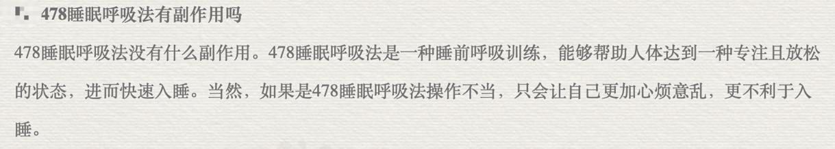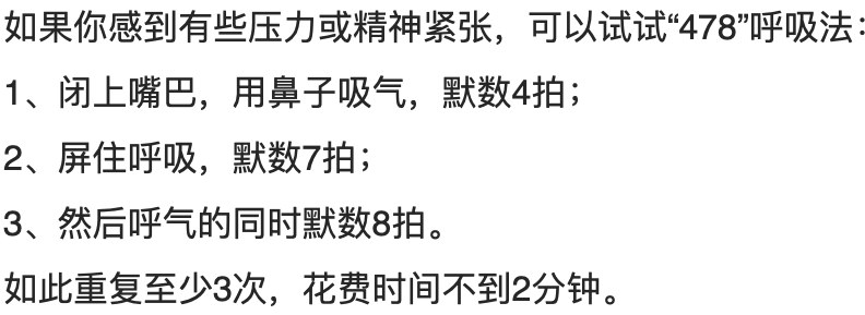 身边很多人都饱受失眠的困扰,大多数在面对失眠的时候,都是选择药物治疗,但众所周知的是,药物治疗很容易产生依赖性,对人体的损害不是一般的大,其实很多人之所以失眠,最大的问题就是晚上睡不着,有人是因为不舍得放下手机,有人则是入睡困难,因此如何快速入睡,才是治疗失眠的最有效方法。 美国哈佛大学的医学博士提出一种快速睡眠的方法,叫做478呼吸法,号称这个方法可以帮助人们在六十秒之内快速入睡,因此引起了网友的热议,而且确实有些人觉得这个方法很好用,这个方法非常简单,因此很多人都愿意尝试一下。那么478呼吸法的作用大吗? 478呼吸法首先就是先用嘴巴把所有的气吐出来,然后闭上嘴巴,用鼻子呼吸,在心里默数四下后,再屏住气数到七,然后用嘴把气吐出来,这需要数到八才能结束,就这样连续做几次,最少做三次,才会有效果,所以在睡觉前可以做三次以上试试,有的人的效果是十分明显的,有的人则是没太大的效果,这都是因人而异,那么478呼吸法有什么坏处吗? 一般来说体虚者不适合长期憋气,以免出现头晕的情况,所以在使用478呼吸法之前,最好是先练习一段时间,基本上478呼吸法是没有太大的副作用的,只要正确的按照程序来,一般是不会引起缺氧的,所以478呼吸法是没有坏处的,不过可能对有的人效果不明显,尤其是精神压力等造成的失眠,478呼吸法基本上是没有作用的。