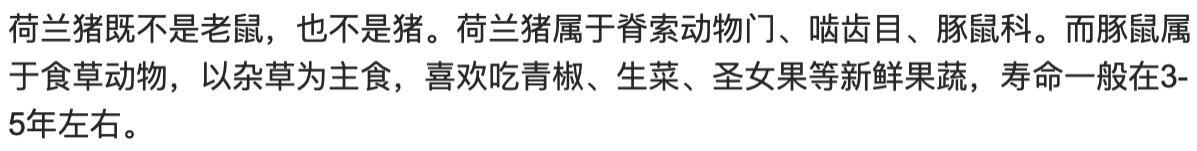 曾经有一段时间,很多小学生都喜欢养一些小宠物,比如说小白鼠、蚕宝宝、荷兰猪之类的,而且这些小宠物都是非常可爱的,比如说荷兰猪,这种小宠物虽然被称为猪,但是和人们印象中的家猪完全不同,而且荷兰猪看起来,似乎和老鼠更为相似,那么荷兰猪到底是猪还是鼠? 民间有句话叫做“没吃过猪肉,还没见过猪跑吗”?这句话是很多人的口头禅,但其实现在见过“猪跑”小孩子真的不多,反而是没吃过猪肉的人是非常少,家猪的体型都是很大的,和可爱是沾不上边的,当然猪崽子其实也挺好玩的,但是它成长速度特别快,在人们还没反应过来的时候,小猪可能已经长成大肥猪了。 因此荷兰猪和家猪是完全不同的,荷兰猪的体型非常娇小,和老鼠看起来差不多大,这种宠物既不是老鼠,也不是猪,而是一种豚鼠,也被称为天竺鼠,是一种没有尾巴的啮齿动物,作为一种群居动物,现在的荷兰猪大都是作为宠物存在的,因为它适应环境的能力不强,所以很难在野外生存。 饲养荷兰猪是有不少禁忌的,第一就是温度,荷兰猪的适宜温度是20度到24度之间,最好不要超过三十度,且不低于十八度;第二就是注意分贝,荷兰猪的听力好,但胆子比较小,所以居住环境不宜有噪声,最好保持在50分贝之下;第三就是饮食,荷兰猪是吃素的,但不能吃洋葱、蒜、韭菜、巧克力之类的食物;第四就是保持笼子中的干燥清洁;第五就是不能给荷兰猪喝生水,第六就是洗澡时不能让水进入荷兰猪的眼睛里,而且水温要适宜,不能太冷或者太热;第七就是给荷兰猪准备一些磨牙的玩具,第八就是荷兰猪是夜行动物,在晚上也需要进食。