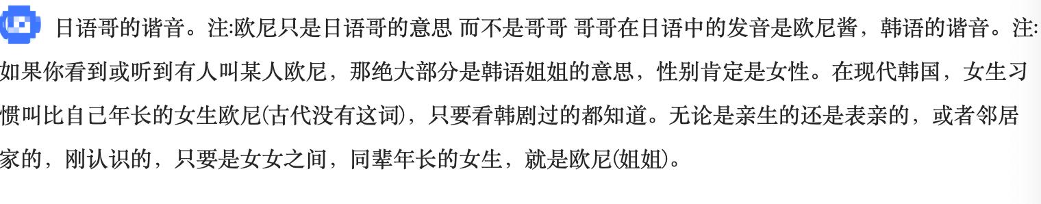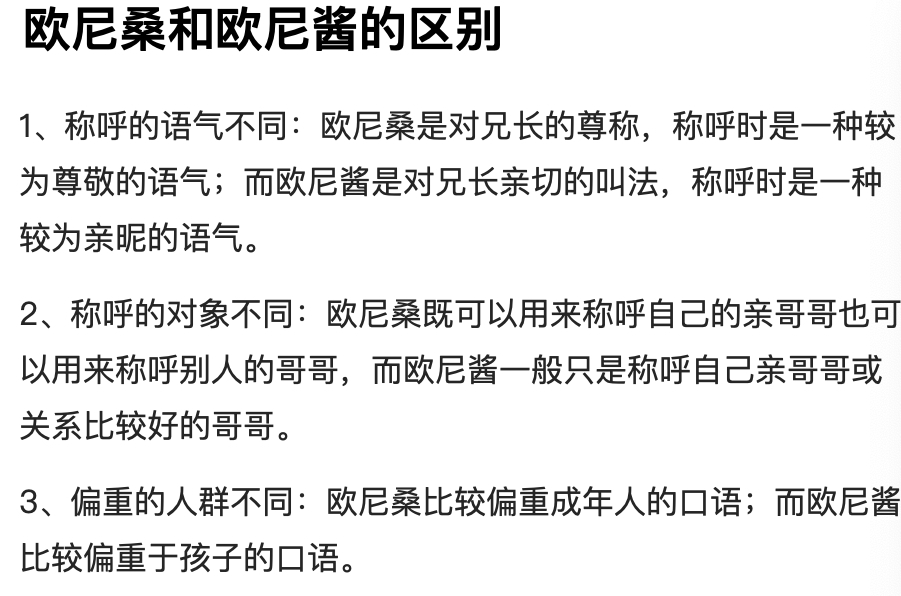 韩剧曾经在国内是非常流行的,从早年的《大长今》、《浪漫满屋》到后来的《放羊的星星》、《太阳的后裔》等,都掀起过一阵韩流热潮,虽然因为各种原因,现在韩剧在中国没有以往那么火,但在年轻人心中,韩剧还是挺有影响力的,估计看过韩剧的人,对“欧巴”、“欧尼”印象深刻,那么欧尼倒底是什么意思? 其实很多人都发现了,韩语的某些发音,和汉语的一些发言是很相似的,比如说爸爸这个称呼,韩语中的发音是“啊爸几”,而在韩语中,欧尼的意思是姐姐,这个姐姐只是一个尊称,并不只是代表亲缘关系,在称呼比自己年纪长的女性的时候,就会称她为“欧尼”,而在日语中,也有欧尼的发音,不过它是哥的谐音,所以欧尼在韩语和日语是完全不同的两个意思。 韩国是很讲究礼仪的一个国家,尤其是对前后辈的关系,韩国人都是非常看重的,所以在称呼上也是需要注意的,尤其是娱乐圈,如果不小心在说话时不用敬语,很可能就会被网友口诛笔伐,不过除了“欧尼”之外,日语中也有欧尼桑和欧尼酱的发音,那么这是什么意思? 欧尼是现代韩国才有的词语,在古代是没有这个称呼的,而日语中的欧尼酱和欧尼桑,都是哥哥的意思,只不过两者还是有区别的,欧尼酱是比较亲昵的一种语气,而欧尼桑则是对哥哥的尊称,大概相当于“兄长大人”的称呼,而且两者的称呼对象也是不同的,欧尼桑出了亲哥外,一般称呼的是亲缘之外的,比自己年长的男性,而欧尼酱则只称呼自己亲哥哥或者特别亲近的哥哥,还有就是欧尼酱是比较偏重于孩子的口语,而欧尼桑则是偏重于成年人的口语。