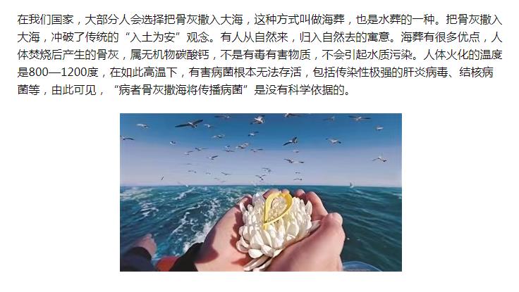 ![]() 目前传统的认为海葬不吉利的说法主要是认为骨灰撒入大海后,逝者“踪迹难寻”,四处漂泊,无根无靠,令在世的亲人没有寄托思念的地方。其实这都是片面的想当然的认为。有这种想法的人,都是相信“超自然力量”存在的人,既然这样想,你不妨可以这么想:整个海洋都是逝者的家,有海的地方就可以追思逝者。 ![]() 海葬的流程不麻烦,在遗体火化之后,向有关部门(殡葬服务中心)预约申请海葬服务,然后预约好海葬的时间。逝者的骨灰需要加工成碎块状,方便往大海中撒落,然后随船出海到规定的地点,海葬时,可安排司仪一名,襄仪两名,礼仪生若干名,方便一遍撒骨灰,一遍撒鲜花等仪式的同步进行。整个撒骨灰的过程持续在15-30分钟左右。 ![]() |