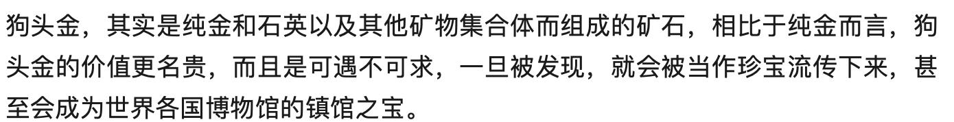中国有句古话叫做“乱世黄金,盛世古董”,国人自古以来都对黄金情有独钟,尤其是到了现在社会,很多人都会为了对抗通货膨胀而购买黄金,黄金的价格其实一直不低,古代还被当成货币来用,虽然说现在黄金只能作为一种装饰品,但价格一直居高不下。 和黄金比起来,狗头金是比较罕见的,甚至很多人都没有听说过,狗头金也是一种矿山,而且是一种比较特殊的矿石,它是一种纯天然的、有多种矿物质合成的,因为有些形似狗的头,所以才有狗头金之称,其实狗头金还有另外一种说法,叫做马蹄金,因为有人说这种矿石的形状特别像马蹄,那么狗头金大概是多少钱一克? 据说狗头金多产于金矿附近,所以它是一种含有杂质的金块,曾经也有种说法,就是狗头金是由流星陨落产生的,但其实这种说法是错误的,它的形成原因是含金的地下水和生物富集沉积形成,而狗头金的价格,并不是按克来交易的,而是整个买的,而且狗头金大都是有价无市,可遇而不可求,具体数额就不得而知了。 狗头金的含金量并不如黄金那样高,它其实是含有不少杂质的,但因为狗头金数量稀少,自古就有“物以稀为贵”的说法,再加上狗头金在古代被赋予了特别的含义,所以通常情况下,狗头金的价格是高于黄金的,在15年有位牧民偶然发现了一块重达15.7斤的狗头金,据说有人出价到300万,而同等重量的黄金,是绝对买不了这个价格的。