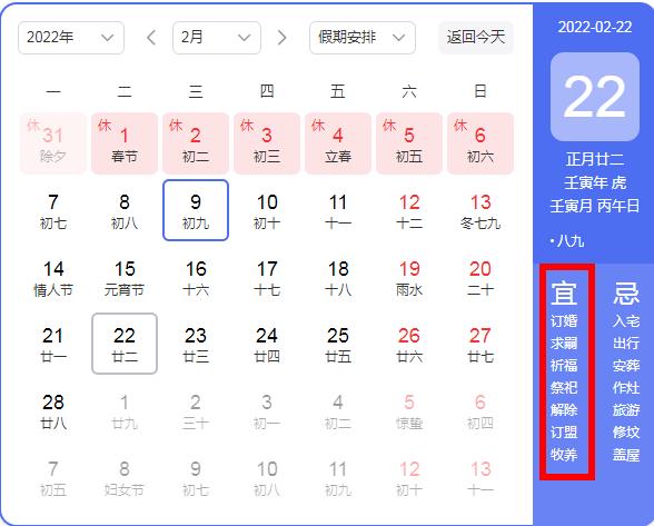 根据中国的老黄历上的吉凶来看,这一天也特别适合订婚、领证,而且恰逢正月22,是个双数日子,适龄的男女们赶快行动起来吧! ![]() |