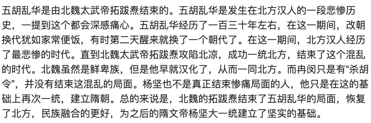 说起中华民族历史上最混乱的时期,绝对非五胡乱华时期莫属,五胡乱华指的是西晋八王之乱时期,塞外的游牧民族内迁,趁着西晋内乱,在华北地区陆续建立多个少数民族政权,历史上称这段时期为五胡十六国,其中的五胡乱华指的是匈奴、鲜卑、羯、氐、羌为代表的五个大部落。 在五胡乱华时期,最受苦的就是汉人,毕竟在胡人的政权建立之前,汉人是高人一等的,但是胡人政权建立后,基本上都是对汉人采取打压政策,甚至视汉人为食物,“两脚羊”的称呼让人不寒而栗,因此在胡人统治下的汉人,活得都很艰辛。 不过也有一些特殊的情况,比如说冉魏政权的冉闵,在位期间就大规模屠杀少数民族,曾颁布“杀胡令”,他这一政策使胡人人口从五百万降到了不足两百万,因此有人说冉闵拯救了汉族,但其实冉闵这一举措,完全就是为了巩固政权,毕竟他是汉人,自然觉得异族是不能信任的,所以才会杀胡,但是他对汉人也不好,在为石虎卖命时期,冉闵也杀了不少汉人,在位期间也没有对汉人有明显的优待,所以说他拯救了汉族是不对的。 因为五胡乱华这个时期太过混乱,所以对于谁结束了五胡乱华,后人一直有许多争议,有人认为是冉闵,有人认为是隋文帝杨坚,但大多数学者认为,是北魏太武帝拓跋焘,虽然说北魏也是少数民族政权,但它汉化的十分彻底,在北魏结束了北方混乱的局面后,才有了后来的隋朝的大一统,所以是北魏的拓跋焘结束了五胡乱华。