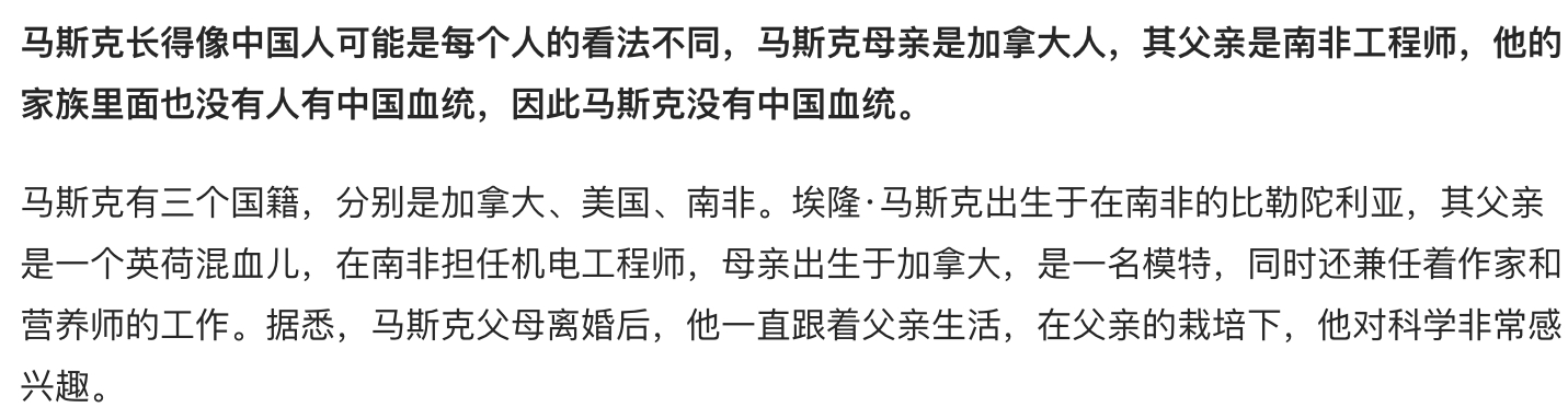 自从电动汽车出现之后,关于它的争议就没有断过,有人觉得这是科技的进步,也有人觉得电动汽车是很难取代燃油汽车的,说起电动汽车,就不得不提起特斯拉,而作为特斯拉的CEO,马斯克也是最为人熟知的亿万富豪之一。不过很多人都觉得马斯克长得好像亚洲人,那么马斯克有华人血统吗? 其实马斯克确实是位很厉害的商人,但人们更关注的,是他的花边绯闻,这位亿万富翁确实是位花花公子,和原配离婚后,马斯克就开始了自己的绯闻生涯,身边的女伴换的特别快,而且马斯克对于妻子也是十分苛刻的,为他生育过五个孩子的原配妻子贾斯汀,几乎是净身出户,所以感情这方面,马斯克一直备受诟病。 虽然马斯克看起来有些像华人,可能是因为基因问题,也可能是一种错觉,其实马斯克并没有华人血统,他的父亲是一位英荷混血儿,是一位机电工程师,他的母亲则是加拿大人,是一位模特,但是马斯克是在南非出生的,所以他有加拿大、美国和南非三重国籍,因为马斯克自幼跟随父亲生活,因此受父亲的影响很深。 后来马斯克对科技那么感兴趣,和他幼年时期的教育有很大的关系,而马斯克的全名叫做埃隆·马斯克,还有个名称叫做伊隆·马斯克,因为伊隆的谐音是“一龙”,因此被中国网友戏称马一龙,现在的马斯克不但是特斯拉的首席执行官,还是太阳城公司的董事会主席,在2021年,马斯克成为世界首富,也是福布斯统计史上资产最多的人。