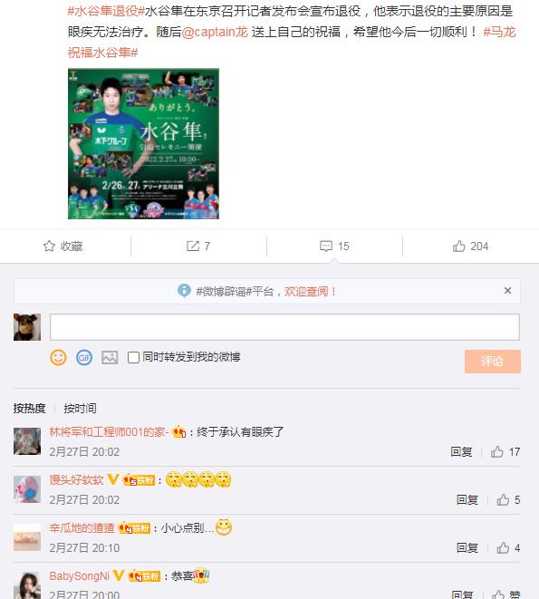 最近,日本著名“挂空挡”运动员水谷隼宣布退役,至于退役的原因他自己也给出了说明,那就是“眼疾无法治疗”。对于水谷隼的这次退役,全世界的乒乓名将送上祝福,马龙、波尔等人纷纷送祝福。不过,这已经不是水谷隼第一次宣布退役了,他在东奥后就宣布退了一次,然后又说还要打,然后现在是第二次。