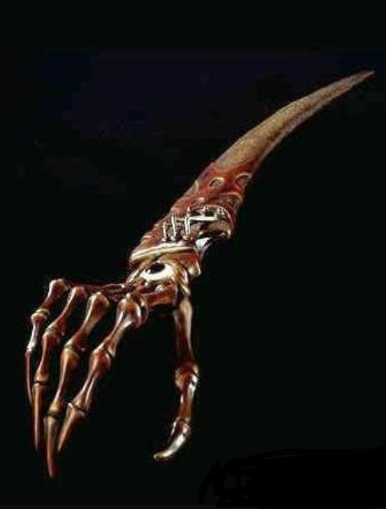 ![]() 鬼手刀:传说这把刀是十四世纪意大利的一个疯铁匠所铸,他将自己妻子的右手砍下做成刀柄,后又将儿子肋骨做成刀刃,并把自己的小腿骨做成刀柄,献给了当时的债主,三天后债主发疯将自己一家人全部烧死了,据说后来得到这把刀的人全都发疯了,而且会像受到诅咒一样一家人全死亡!不过这把刀的出处来自民间传说,并不是真实存在的。 ![]()