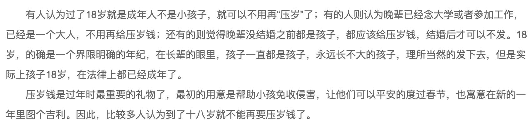 虽然现在年味越来越淡了,但还是有很多小孩子期待过年的,毕竟过年的时候可以收压岁钱,在人们的印象中,压岁钱是长辈在过年时给小辈们发的红包,主要是为了图个好彩头,尤其是年纪越小的孩子,越容易得到压岁钱,那么到什么时候就不能要压岁钱了? 在我们的传统文化中,压岁钱有保平安、压邪崇的意思,所以压岁钱带有一种美好的祝愿,过年去亲戚家做客时,就会受到长辈递过来的红包,不过有些人年纪大了后,就不太愿意接红包了,毕竟会觉得不好意思的,家中父母也会让孩子拒绝,那么22岁就不能要压岁钱了吗? 在22岁的时候,已经是个成年人了,这个年纪即将毕业,或者已经毕业参加工作了,所以再要长辈的红包就会不好意思,如果是父母的红包,拿着也可以,但如果是亲戚给的红包,再收的话就不太好了,因此22岁早已经过了收红包的年纪,所以再收红包就说不过去了,当然如果长辈非要给的话,收着也不是不可以,反正总有还回去的一天。 虽然说现在很多人二十岁的时候还觉得自己是个孩子,但他本质上来说已经是个成年人了,所以大多数都觉得,压岁钱给到18岁就可以不给了,当然也可以根据自身条件,给到大学毕业也是可以的,毕竟每个地方的风俗习惯是不同的,压岁钱其实最重要的不是钱,而是一种美好的祝愿,所以有些地方小辈也会给长辈压岁钱,压岁钱给到多少岁合适,还是要根据自身情况来看。