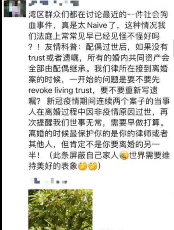 ![]() 目前最新情况是湾区渣男和新欢报警,已经成功把岳父母赶出前妻故居,根据其他业主举报,他还当着二老的面,把前妻骨灰冲入下水道里。而且因为他的事迹被曝光,当地华人圈已经对其掀起声讨,现在他已经挂出和前妻的房子,准备举家搬去西雅图,但西雅图那边的华人,也都知道了他的事迹,也对其发出了声讨。 |