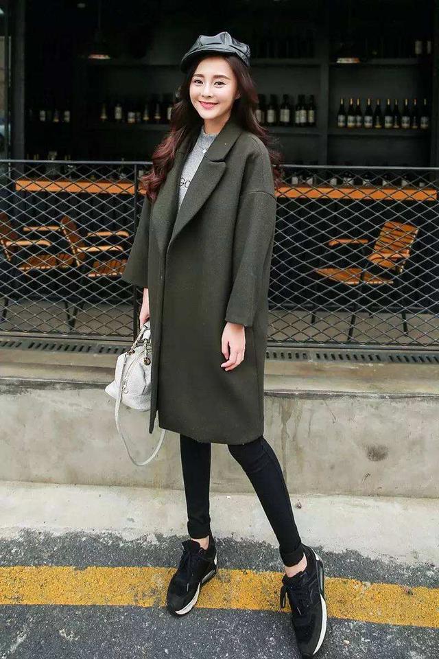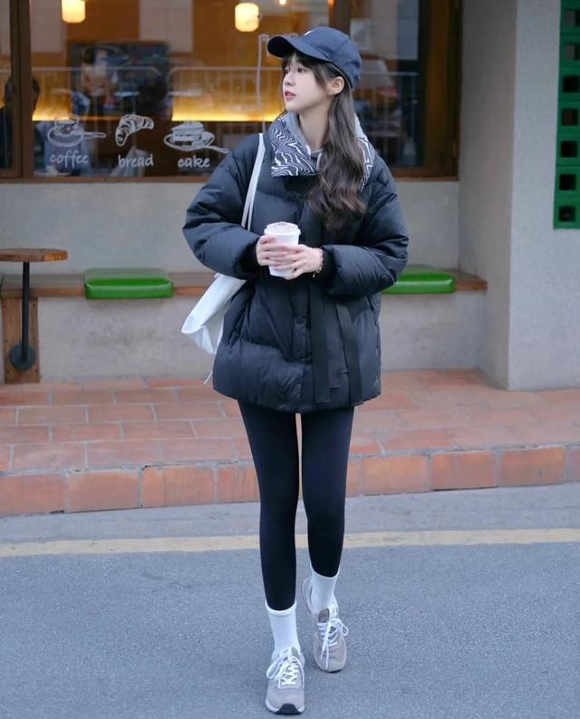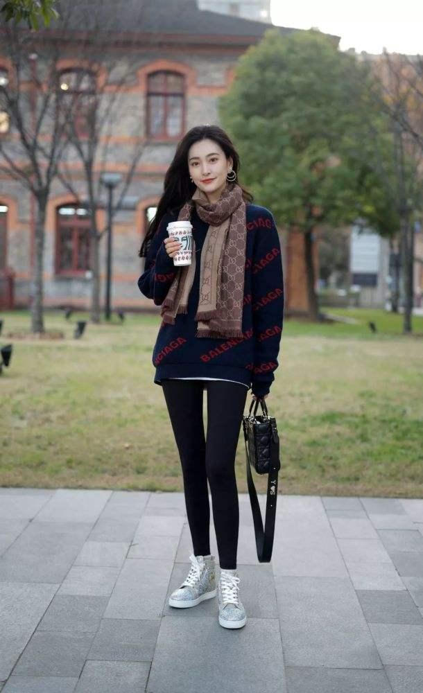 在秋天,靴子也是非常受欢迎的鞋子。不管是靴子还是短靴,总有它的用处,打底裤和靴子是最经典的组合。比如这组造型,黑色打底裤搭配棕色短靴,非常优雅迷人,棕色与黑色形成对比,让造型更加时尚。 如果上衣太臃肿,那么下面搭配打底裤是个不错的选择,营造出上宽下紧的效果,视觉上显得更瘦。 Look3:打底裤白鞋