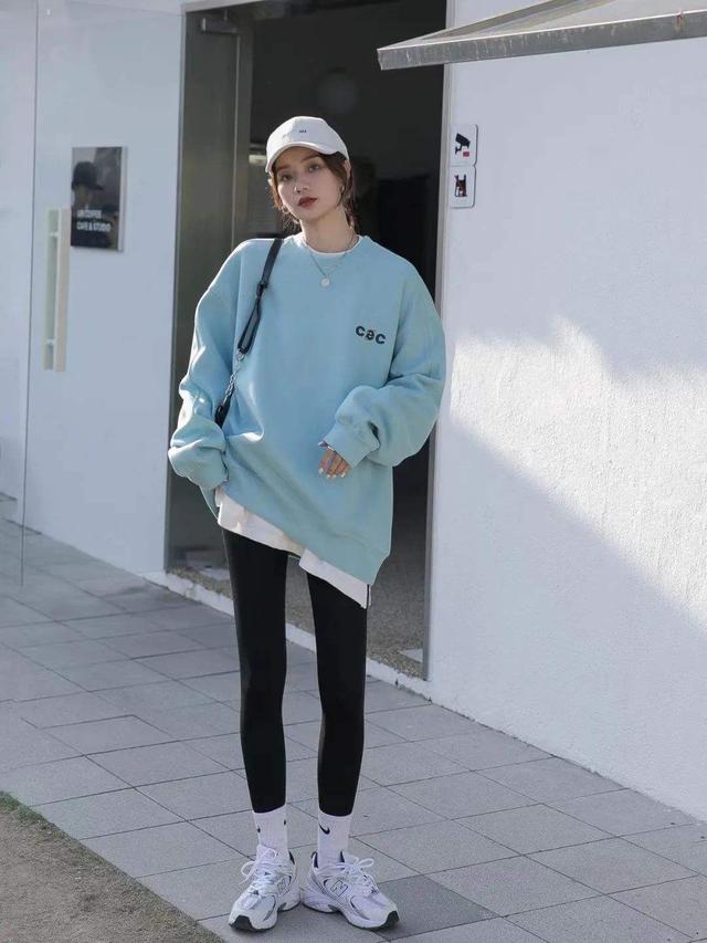 其实除了运动鞋,还有浅白色的鞋子可以选择,搭配打底裤非常休闲随意,尤其是初秋,气温不算太低的时候。选择九分打底裤搭配白鞋,更加清爽舒适,同时也能起到显腿细的作用。 而且黑白的搭配是经典的组合。再加上小白鞋比较轻,不会造成头重脚轻的效果。整体比例还是可以保持的非常和谐美观。