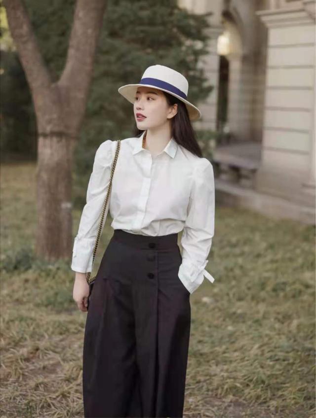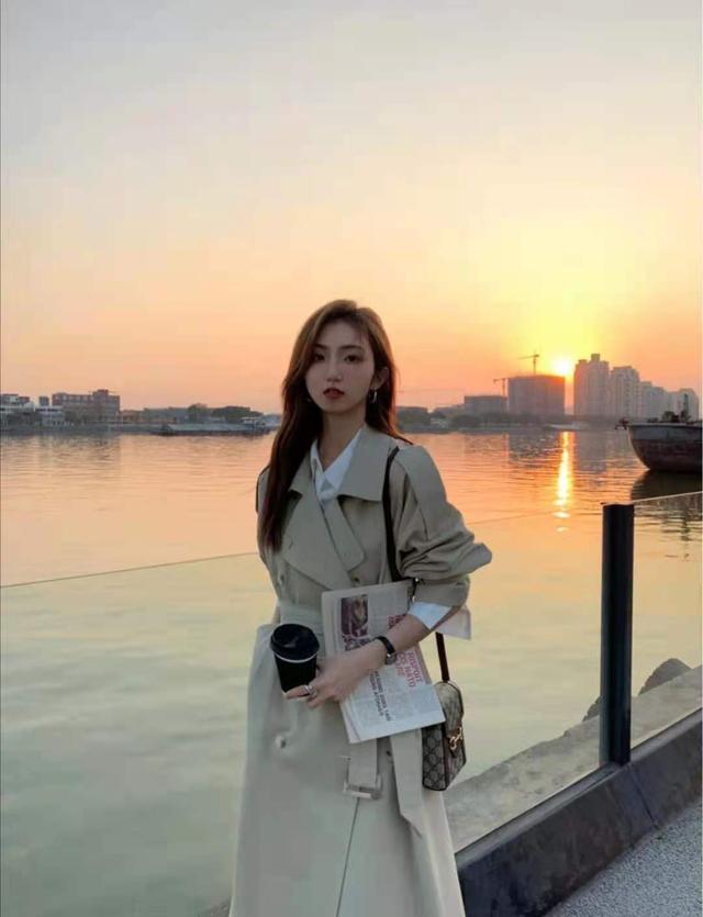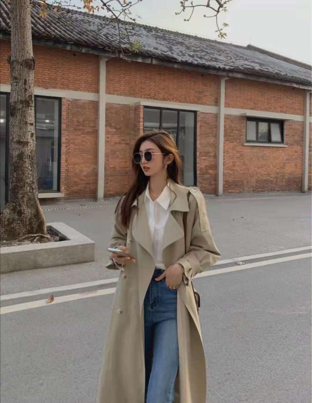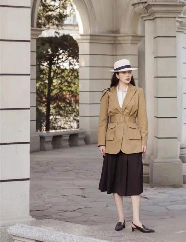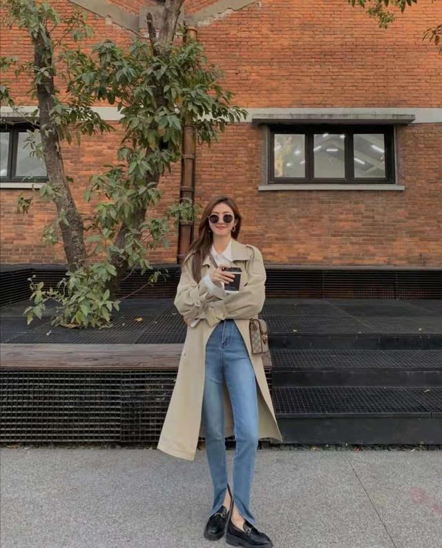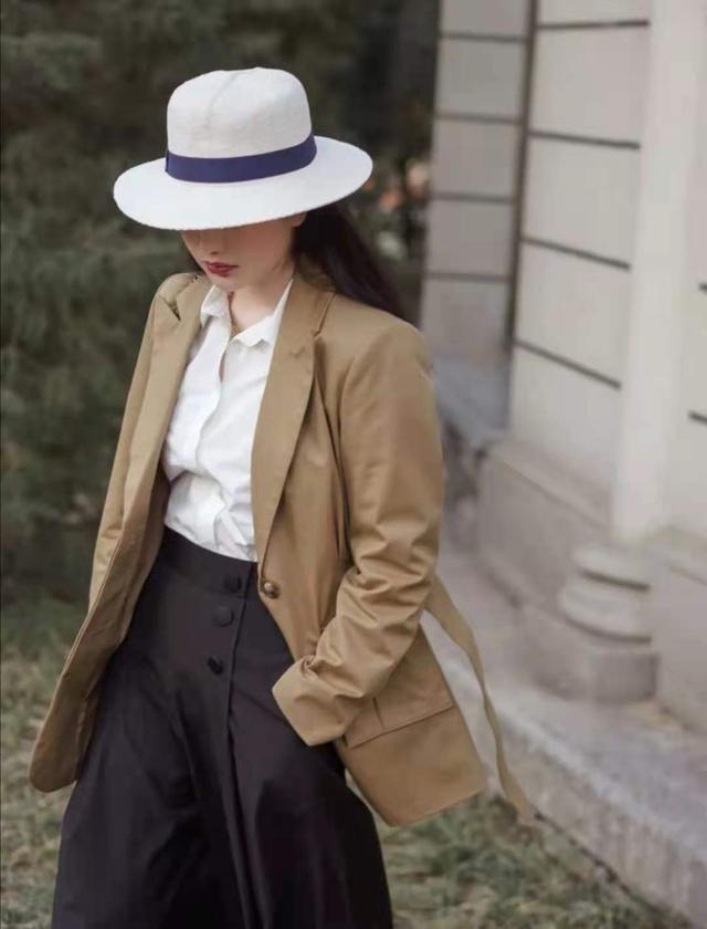 通勤风很大,很文艺。上衣是百搭的白衬衫。袖口的小设计和球场般的肩袖比较特别,质感也很好。适合通勤,约会或者上学。下身搭配黑色阔腿裤裙,只有七分长,不会那么沉闷。当你戴上高顶礼帽,不加外套的时候,还挺法式通勤装的,很英伦学院派。 卡其色的半西装半礼服大衣非常适合这个季节。系上腰带很文艺,气质一下子就内敛了。它非常适合通勤,我非常喜欢它。 Look3卡其色风衣搭配白色衬衫和蓝色直开叉牛仔裤。