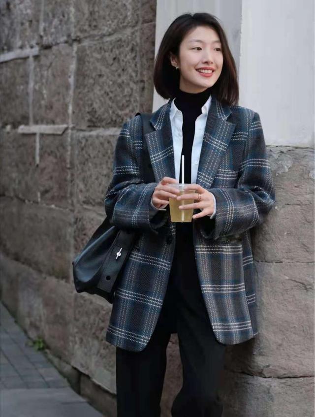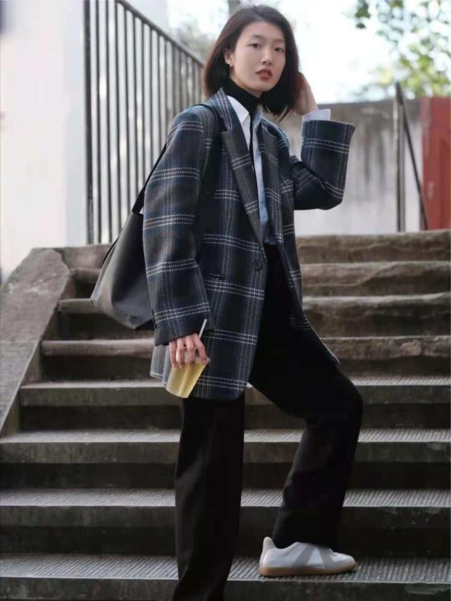 衬衫、风衣、拖地裤,都是春天必不可少的穿搭。卡其色风衣特别百搭,淑女风格可以搭配裙子。长款风衣特别有气质,颜色是浅卡其色,温柔帅气。 内搭白色基础款衬衫,是春天必不可少的单品。可以单穿也可以叠穿,下面是蓝色直筒开叉牛仔裤。为了让整体看起来更休闲一点,我选择了最近流行的开叉牛仔裤,修身又有点复古。 Look4格子西装外套,白衬衫,黑高领,黑西装裤,德式训练鞋。