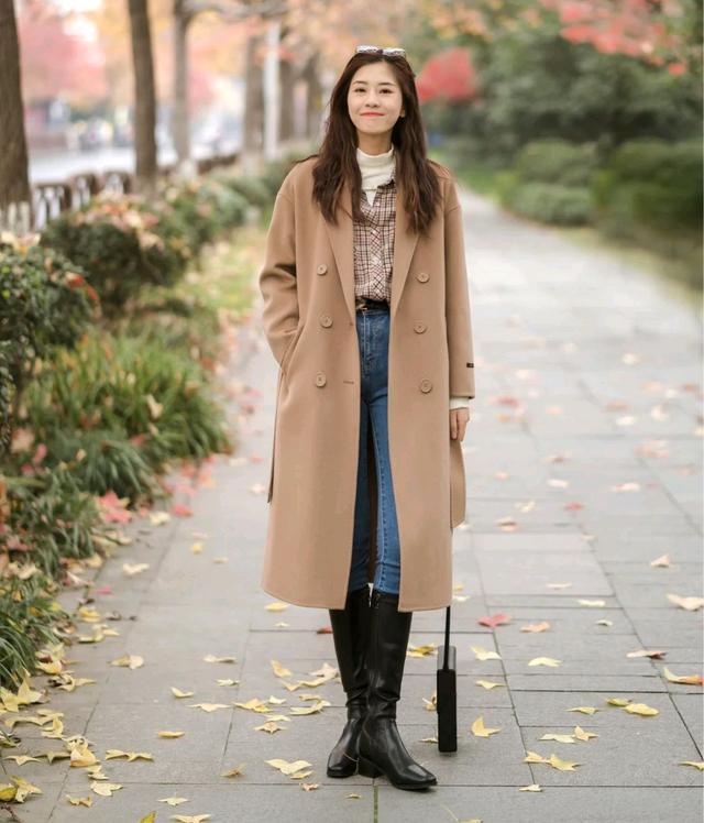 驼色大衣米色打底格子衬衫,不穿驼色大衣,你不会知道它到底有多美。简约大方的款式,经典百搭,H字版型,对所有身材都有很好的包容效果。一句话,就是瘦身! 穿内米底的白色格子衬衫真的很时尚很好看,很有层次感吧?下身选择经典的蓝色牛仔裤,搭配黑色及膝长靴。简单又帅气,喜欢的女生就穿吧。 无论你穿什么,颜色搭配都不会错。而且配色的搭配也很高级,不知道怎么穿的女生也能轻松驾驭!驼色外套搭配内搭,充满高级感。
