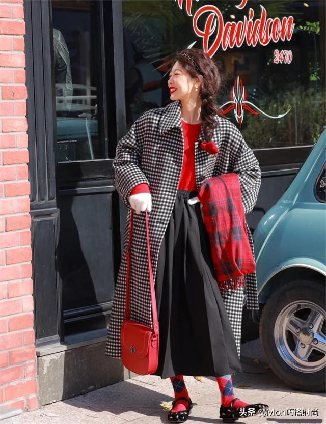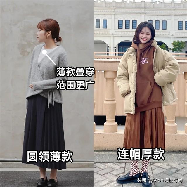 圆领毛衣是最适合做打底的毛衣类型。它的上身一点也不臃肿,还能利用特殊的设计和抢眼的颜色为整体增添一抹亮点。 一件如玫瑰般绚烂的红色毛衣搭配黑色百褶裙,美得出乎意料!搭配今年最时髦的千鸟格大衣,简直就是一套人见人爱的搭配! 羽绒服叠在简单的毛衣里。 如果毛衣和羽绒服叠搭,那么百褶裙和毛衣尽量选择简约大气的款式。服装本身的线条和轮廓一定要清晰,避免臃肿是高级感的首要条件。 怡和 千褶裙保持同色系,配上灰色短款羽绒服丝毫不见笨重感。千褶裙独特的褶皱反而给整体增添了一丝灵气和韵味。(三)卫衣+千褶裙的实用配色技巧 ①干货集锦
