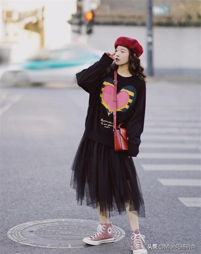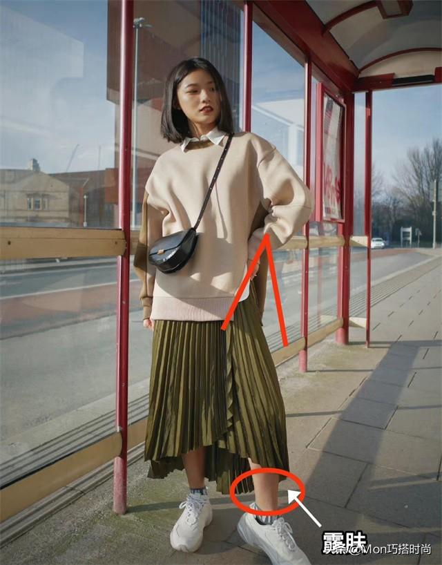 不管是采用什么风格的穿衣路线,卫衣搭配千褶裙时,彩色出现的数量尽量不超过三个,撞色搭配一定要有主次之分。 卫衣和千褶裙之间只能有一个比较突出的图案,遵循简繁结合的搭配方式。小个子尽量将吸睛的色彩放在上半身。 ②实例解析