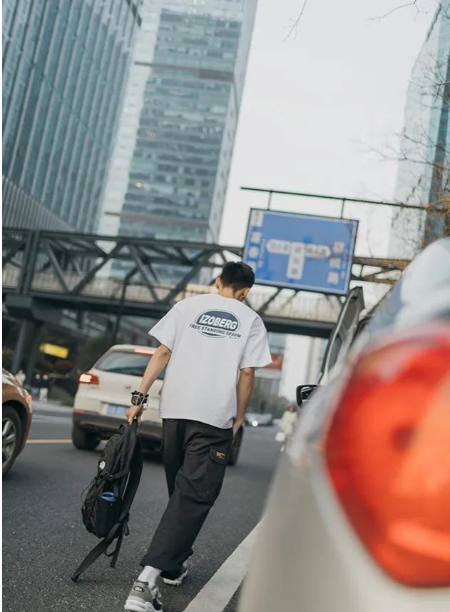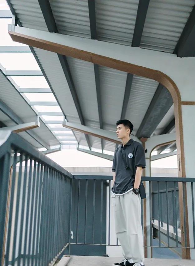 第三套:深灰色Polo浅灰色裤子和浅灰色鞋子 颜色应用:深灰浅灰白(装饰色) 解析:上身t恤的白色基础屁帘,搭配深灰色短袖Polo,还有一条齐腰的街头打底裤,最后上脚一双黑色鞋子稳定重心,街头味十足。