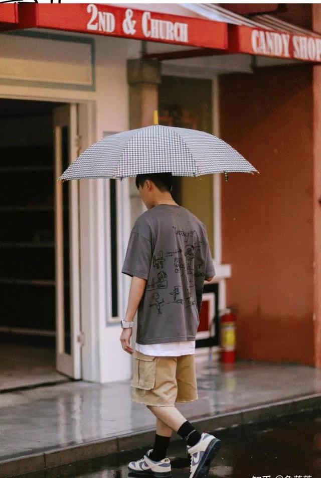 第四套:涂鸦t恤卡其布短裤 颜色应用:深灰色卡其色 解析:上身一件深灰色印花半袖T,搭配一条卡其色街头休闲裤,脚上一双黑色手破帆布鞋,最后一条项链和手表来增添细节。整套比之前的舒服多了。