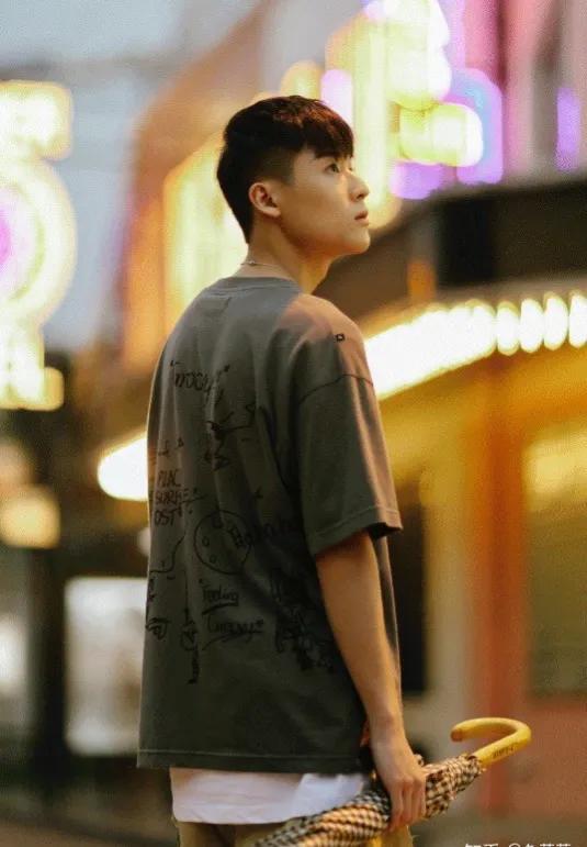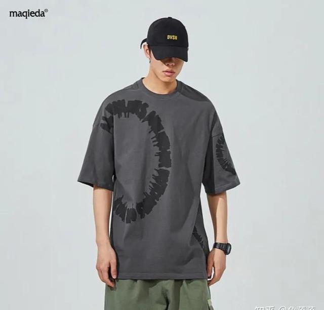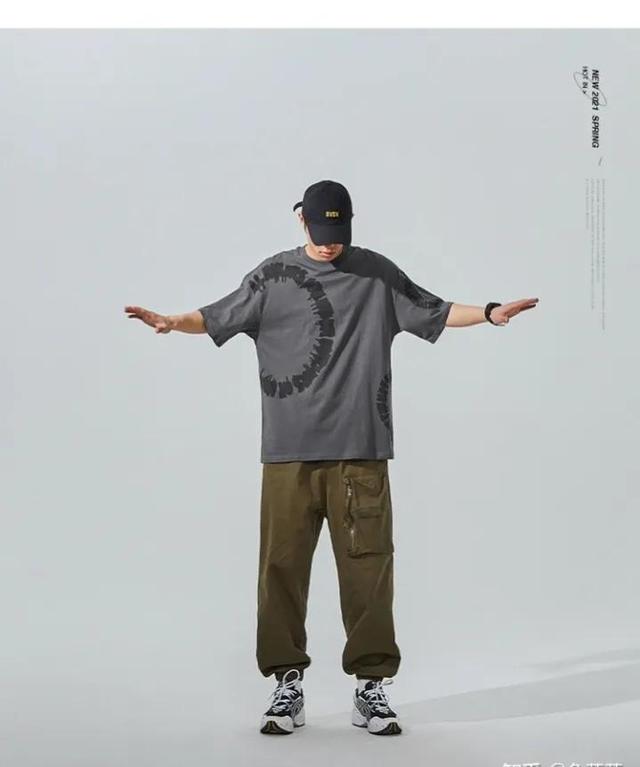 第五套:灰色印花t恤军绿色工作服 颜色应用:灰色、军灰色、绿色。 解析:上身一件简单的立体印花灰色短T,搭配一顶黑色棒球帽,一条军绿色绳索受票人的古装裤,老爸的鞋子,黑、白、灰三色贯穿全身。很运动很酷,整个身体表达的态度比较硬。