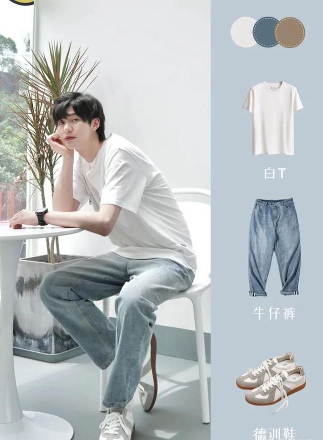 第六套:白T牛仔裤 色彩运用:“蓝白”=清爽百搭的色调搭配分析:这种配色就像蓝天白云的组合,给人无限的阳光和干净的感觉。白T牛仔裤是女生休闲款,言情小说里的“邻家男人穿”!