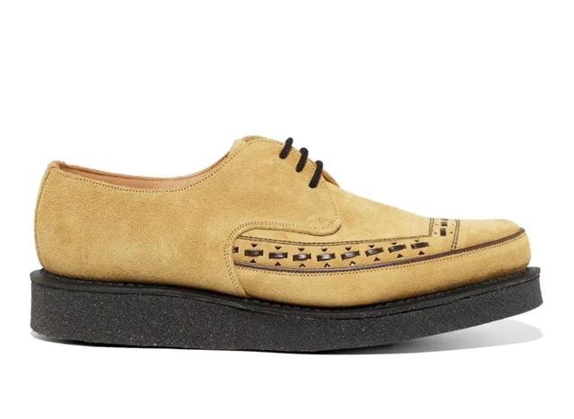 要选出最能代表品牌个性的鞋款,叶子认为仍然是尖头 Creeper,只不过现在它现在不叫 Brothel Creeper 了,而是改名 Creeper Gibson。 在外形上,Creeper Gibson 跟之前的 Brothel Creeper 没有太大的不同,都是厚底尖头的款式,前鞋面有“穿孔”设计作为亮点,鞋底采用固特异技术,搭载橡胶皱底,一般鞋跟高 36 mm,鞋头高 24 mm。 只是对比来说,现在的 Creeper Gibson 使用的原料会更加优质。
