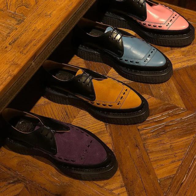 ▲ Alistair Waterfield 在这里如此年轻的创意总监带领之下,George Cox 展开了与各种品牌的联名合作,在原本品牌摇滚美学内核的基础上,又拓展出了多元的风格理念,从原本的百年老鞋的定位中,成功进入到了年轻潮流领域,再次引领风尚。 这或许,也是品牌朋克的一面体现吧!