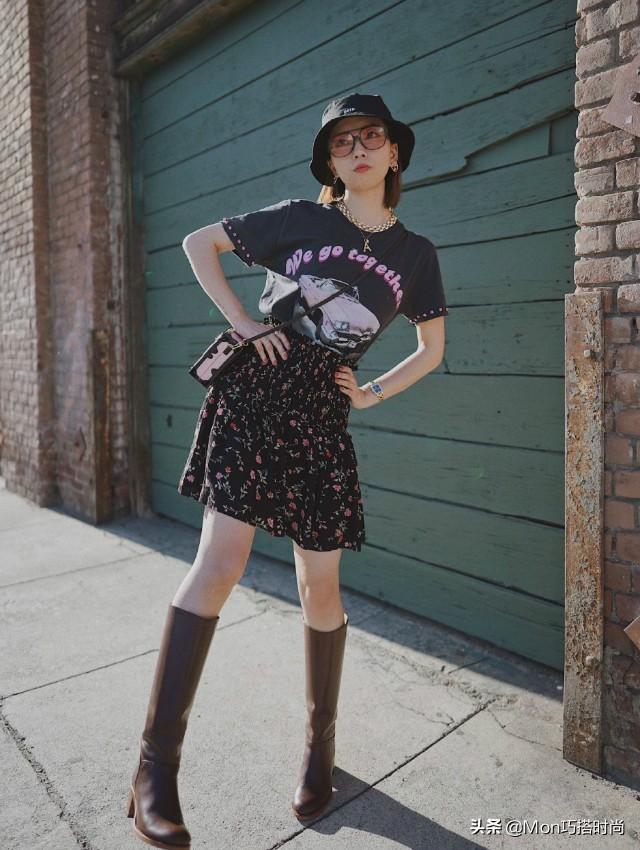 全身衣服都是同色搭配,可以缓解大面积印花带来的杂乱感,让搭配更加清新简洁。 个性印花t恤搭配深色碎花裙,服装是偏亲亲可爱的少女风格连衣裙。搭配精致的棕色皮靴,搭配起来会变得有质感。 二、碎花长裙配白鞋