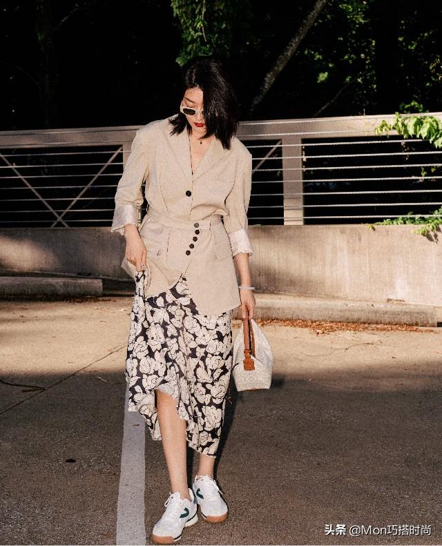 略带正式感的米色西装,配上黑白印花雪纺裙长款,是知性风和浪漫风的结合,稍加组合就能营造出百变风情。 这种长款大衣,单穿的时候需要腰带来提升腰线,再搭配简单的小白鞋,越看越好看。 协调裙子和鞋子的颜色。