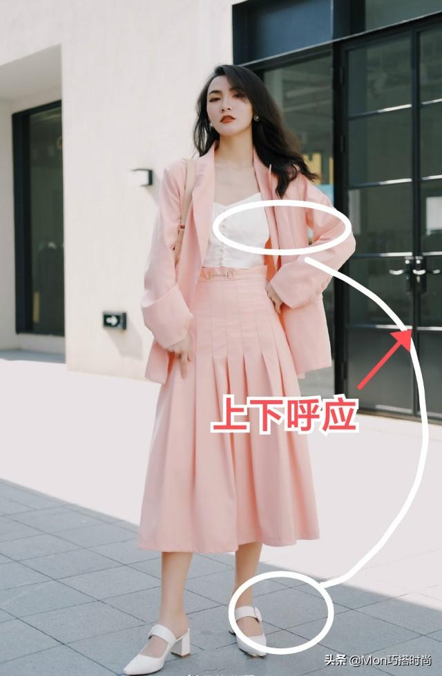 在大面积使用色彩单品时,使用色彩呼应法会使穿着更加和谐统一。 白色的玛丽珍鞋和内置抹胸相互呼应,再加上清新的糖果粉套装和百褶裙,空气中充满了甜甜的味道~ 第二点是从版本上下功夫