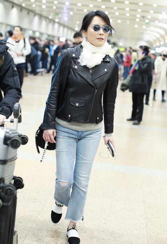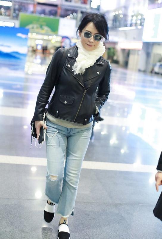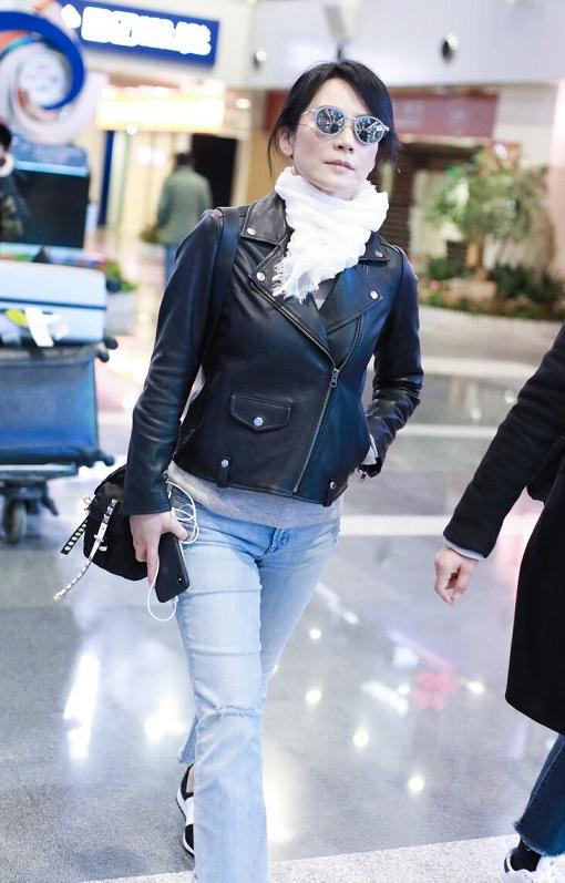 黑色皮衣是所有皮衣中最百搭的。黑色的显瘦效果可以减少皮料的膨胀感,所以不需要担心显瘦的问题。同时,姐妹们也可以看看时尚精英们尝试的皮夹克设计。加上翻领,看起来会时尚很多,不用担心穿出臃肿感。无论俞飞鸿穿什么,他一定会赢。黑色皮衣搭配牛仔裤,简洁利落,清爽又充满灵气。