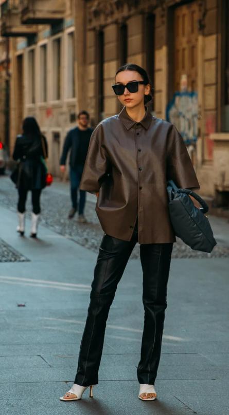 时尚的人敢于尝试别人没试过的衣服。比如下面这些新潮的人就尝试过很多时髦的皮裤,皮裤和皮衣的搭配可以形成材质的呼应。 不过大家要注意皮裤的版型。最好试试直筒皮裤。瘦身效果会好很多,同时对身体也更宽容。腿粗的小淑女不用怕。