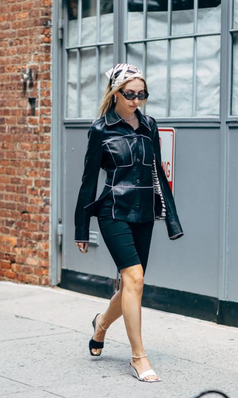 下面这件皮夹克就是这种情况。黑色皮夹克结合收腰设计真的很显身材,身材比例好的小姐穿起来会超级性感。下身搭配现在流行的黑色骑行裤,可以修饰你的身材比例,真的很时尚。