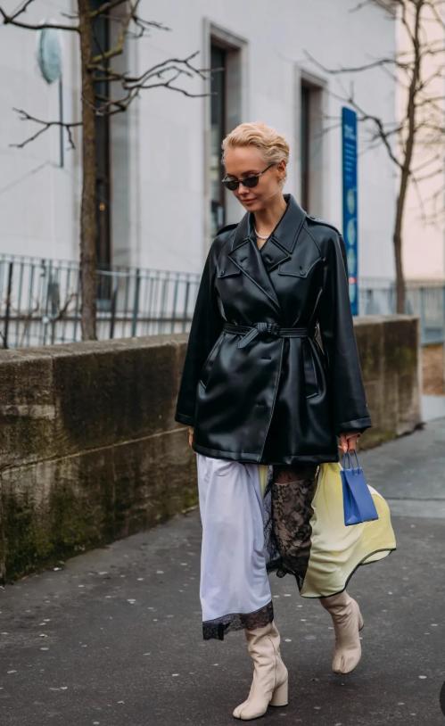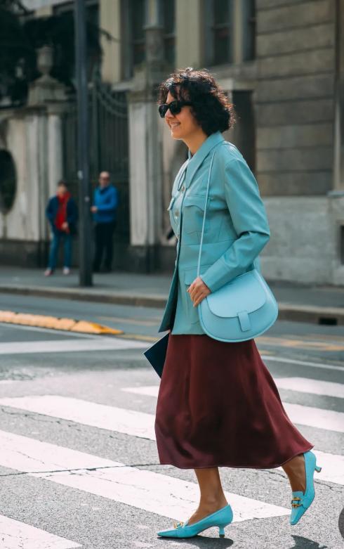 想打破常规又不想撞见别人?彩色皮衣值得拥有。聪明的小姐姐可以直接尝试彩色皮衣进行凹造型,比如下面的蓝色皮衣。色彩的加持可以打破常规,不仅凹造型可以在秋冬使用,想改变风格的时候也可以选择。 搭配下半身的裙摆,优雅迷人,顺便结合蓝色高跟鞋,颜色与自身的时尚感相呼应。