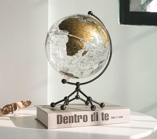 参考价格:138 透明地球仪饰品 这是一个非常时髦的地球仪。里面的透明看起来很清晰,做餐桌摆件也不会拥挤。还能给室内装饰增添设计感。 整个地球直径20cm,竖立时高30cm,球体为透明亚克力材质,陆地为丝网印刷技术,海洋为透光设计,内部印有文字,不会影响外部清洁和触摸。