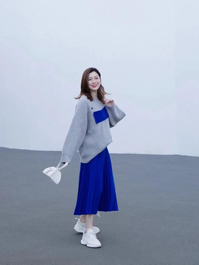 如果你想穿得不那么华丽,就在下身穿上明亮的克莱恩蓝。用克莱恩的蓝色裙子或裤子来装饰更有层次感的造型。这样慵懒的风格,传递的是更愉悦的美感。灰色套头衫搭配a字裙,巧妙的将服装的边角收拢,让整体造型更加出众。拿一双白色运动鞋,休闲舒适。