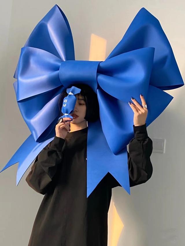 克莱恩蓝不仅可以作为服装穿着,还可以作为配饰点缀。如此巨大的蝴蝶结自然让整体风格更加抢眼。在日常生活中,我们无法驾驭这种夸张的风格,但我们也可以选择精致的蝴蝶结作为配饰来点缀自己的发型,让自己的美变得不同寻常。同时,克莱恩蓝吊坠也能让你的衣服更加时尚。