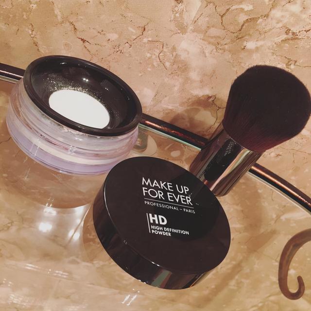 定妆粉里的make for ever散粉很细腻,对皮肤有一种自动柔焦的感觉。细腻自然的粉质,隐形毛孔,肤色均匀。夏天的时候可以更好的控油和柔化重点,效果真的非常好,还能提高妆容的精细度。左上脸和右脸有明显的对比。