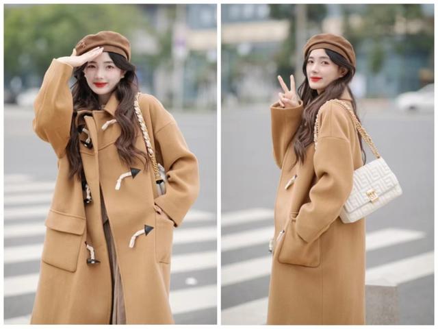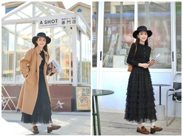 图5,图6克梅尔服装店 秋色棕色毛呢大衣有两种不同的气质,系带和开衩,搭配黑色短裙和黑色蕾丝,一顶复古色的黑色帽子,优雅又有气质~