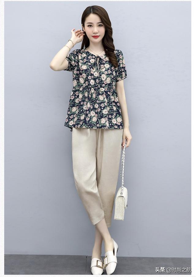 晓凤名媛清舒雪纺两件套 简约印花西装,时尚POLO翻领设计,贴合颈部曲线,修饰脸型,压皱松紧腰带设计,巧妙遮肚小肉,修身直筒裤腿,九分剪裁,高视觉。  |